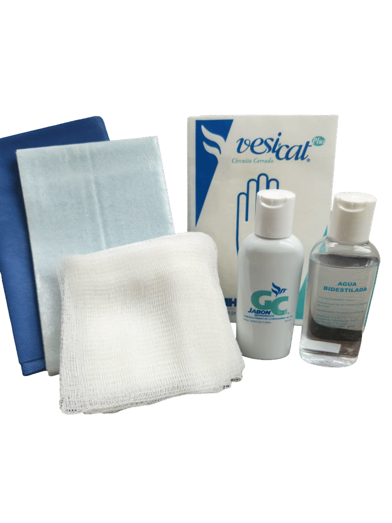 Kit estéril, desechable y todo-en-uno para la instalación segura de drenaje urinario con circuito cerrado.