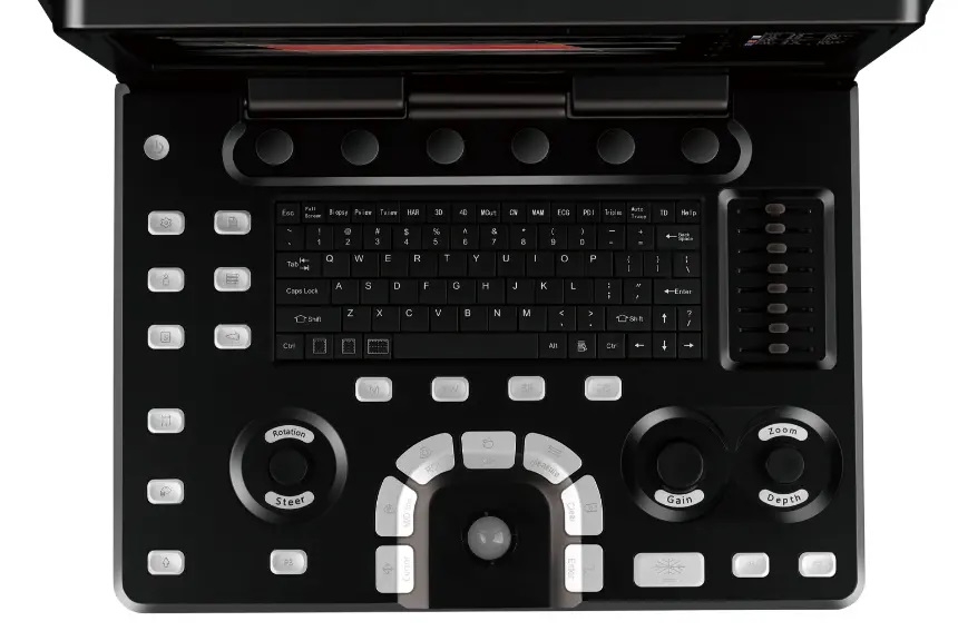 Diseño italiano, pantalla táctil de 15.6″, con Doppler, paquetería cardiológica y tecnologías VSpeckle, VFusion, VZoom, ideales para imágenes de alta resolución.